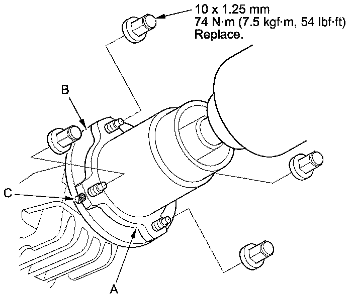 3. Install the propeller shaft (A) to the transfer companion flange (B) by aligning the reference marks (C). Make sure you use new mounting nuts.