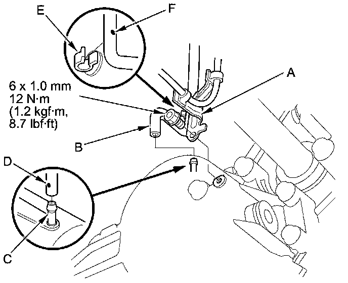 4. Secure the transfer breather hose bracket (A) on the transfer assembly with the bolt, and connect the breather hose (B) over the breather pipe (C) with the dot mark (D) to the rear side of the vehicle. If the breather hose was removed from the clamp (E), install the hose at the dot (F) on the clamp.