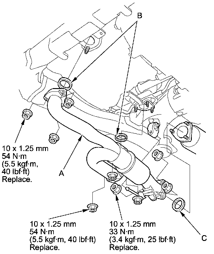 5. Install exhaust pipe A with the new self-locking nuts and new gaskets (B) (C).