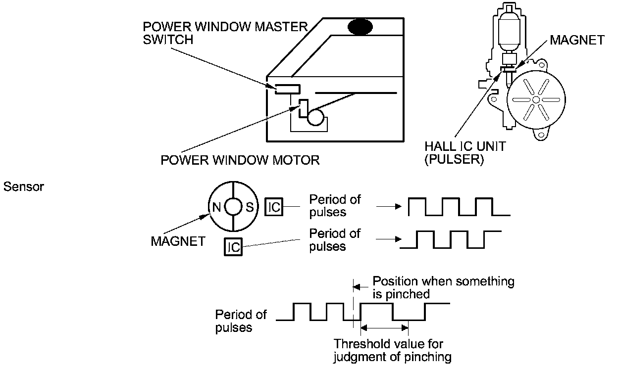 The power window motor incorporates a Hall IC unit (pulser) which generates pulses during the motor's operation and sends pulses to the power window control unit. As soon as the power window control unit detects a change in pulse frequency from the Hall IC unit (pulser), the power window control unit makes the power window motor stop and reverse. This prevents pinching your hand or fingers during auto-up operation. The auto reverse function does not work when the driver's window switch is held in the up position.