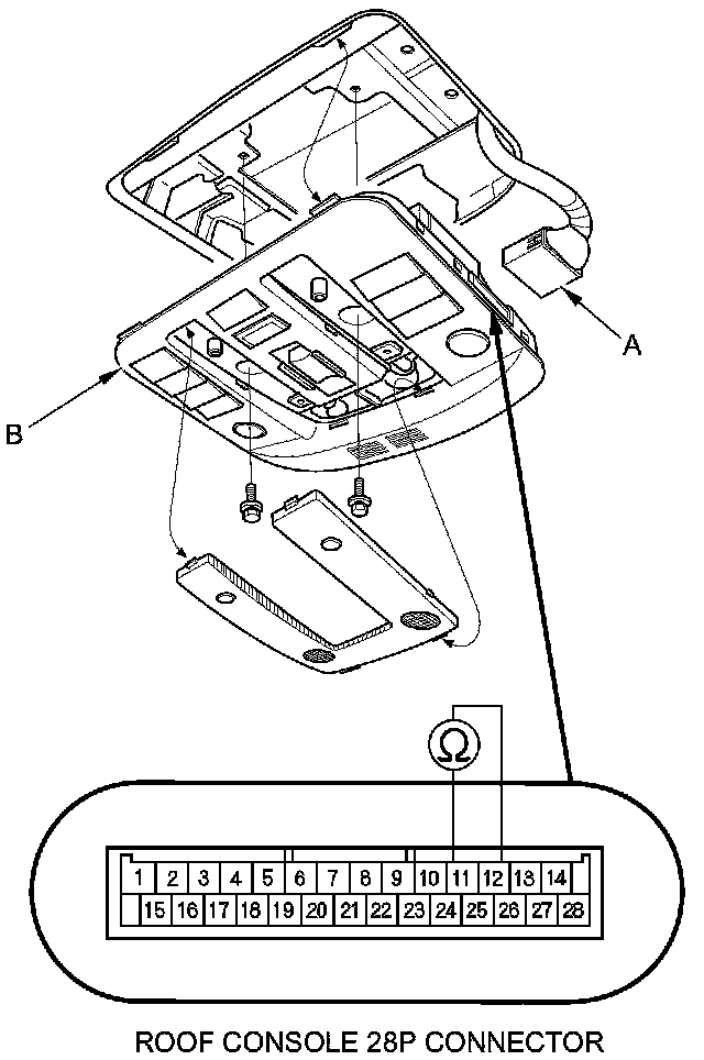 2. Disconnect the 28P connector (A) from the roof console (B).