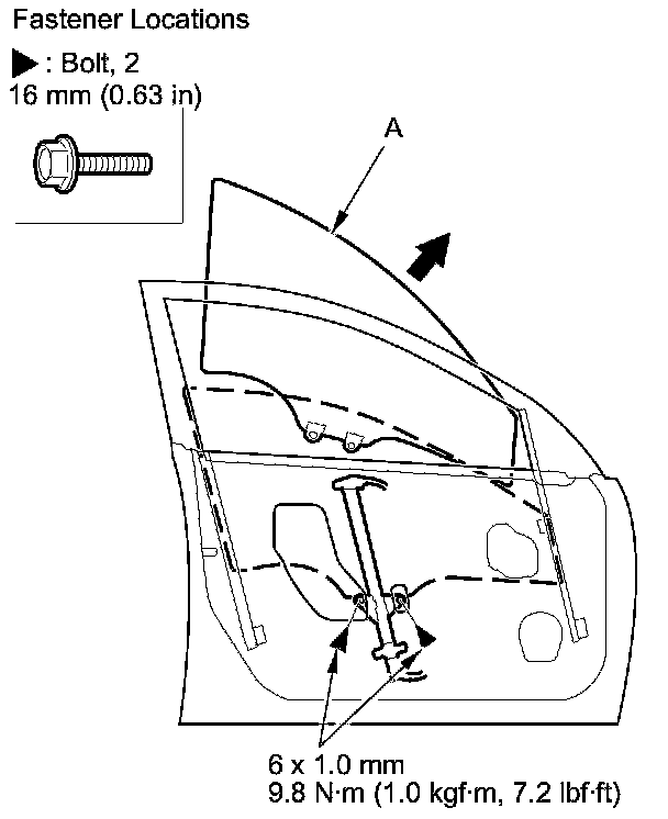 2. Carefully move the glass (A) until you can see the glass mounting bolts, then remove them. Carefully pull out the glass through the window slot. Take care not to drop the glass inside the door.