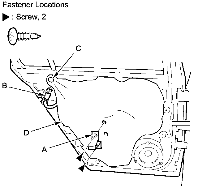 2. Remove the screws, then remove the door pull pocket bracket (A). Disconnect the power door lock actuator connector (B), and remove the plug cap (C), and then remove the plastic cover (D).