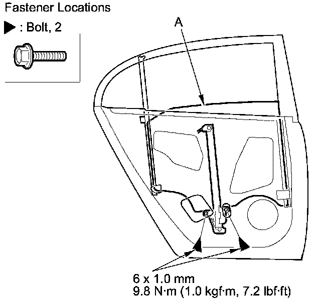 3. Carefully move the glass (A) until you can see the glass mounting bolts, then remove them. Carefully lower the glass into the door. Take care not to drop the glass inside the door.