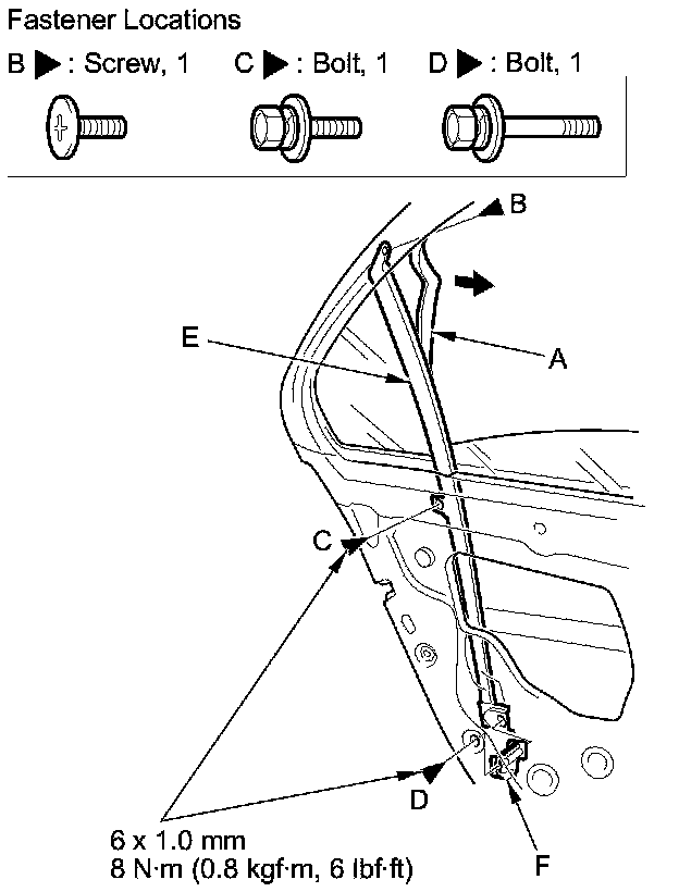 4. Pull the glass run channel (A) away as needed, then remove the screw (B). Remove the bolts (C, D) securing the rear lower channel (E), then remove the collar (F).