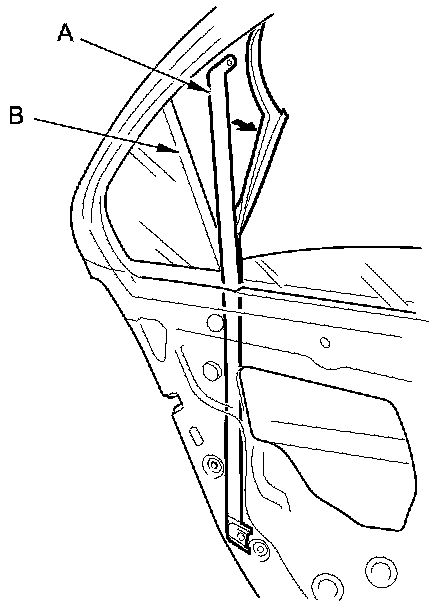 5. Pull the upper portion of the rear lower channel (A) forward to remove it from the door quarter glass seal (B).