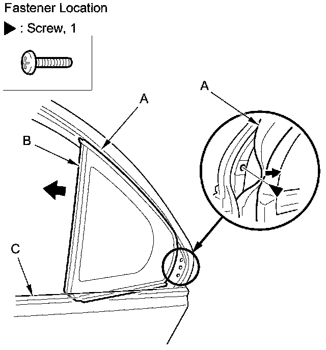 6. Pull the door weatherstrip (A), and remove the screw, then remove the quarter glass (B). Take care not to damage the door glass outer weatherstrip (C).
