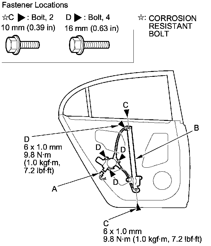 9. Remove the bolts (C), and loosen the bolts (D), then remove the regulator through the hole in the door.