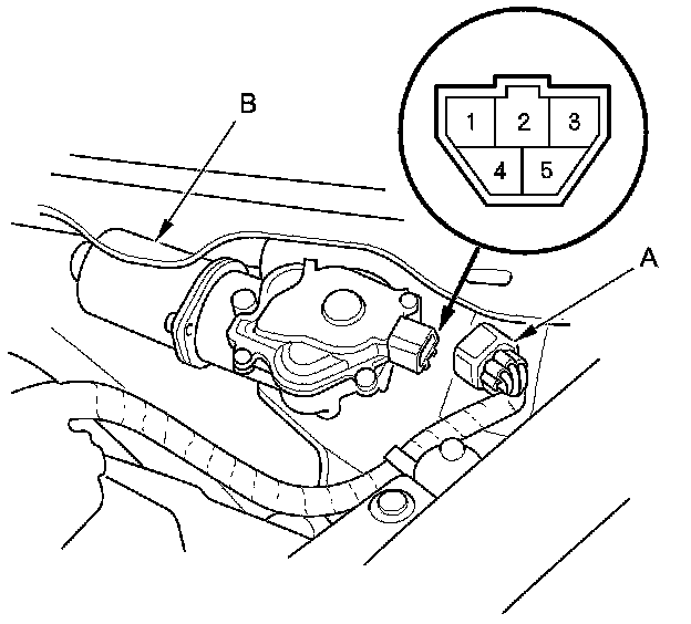3. Disconnect the 5P connector (A) from the wiper motor (B).