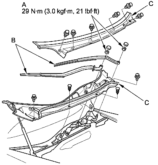 Separate the windshield wiper linkage (B) from the wiper motor (C).