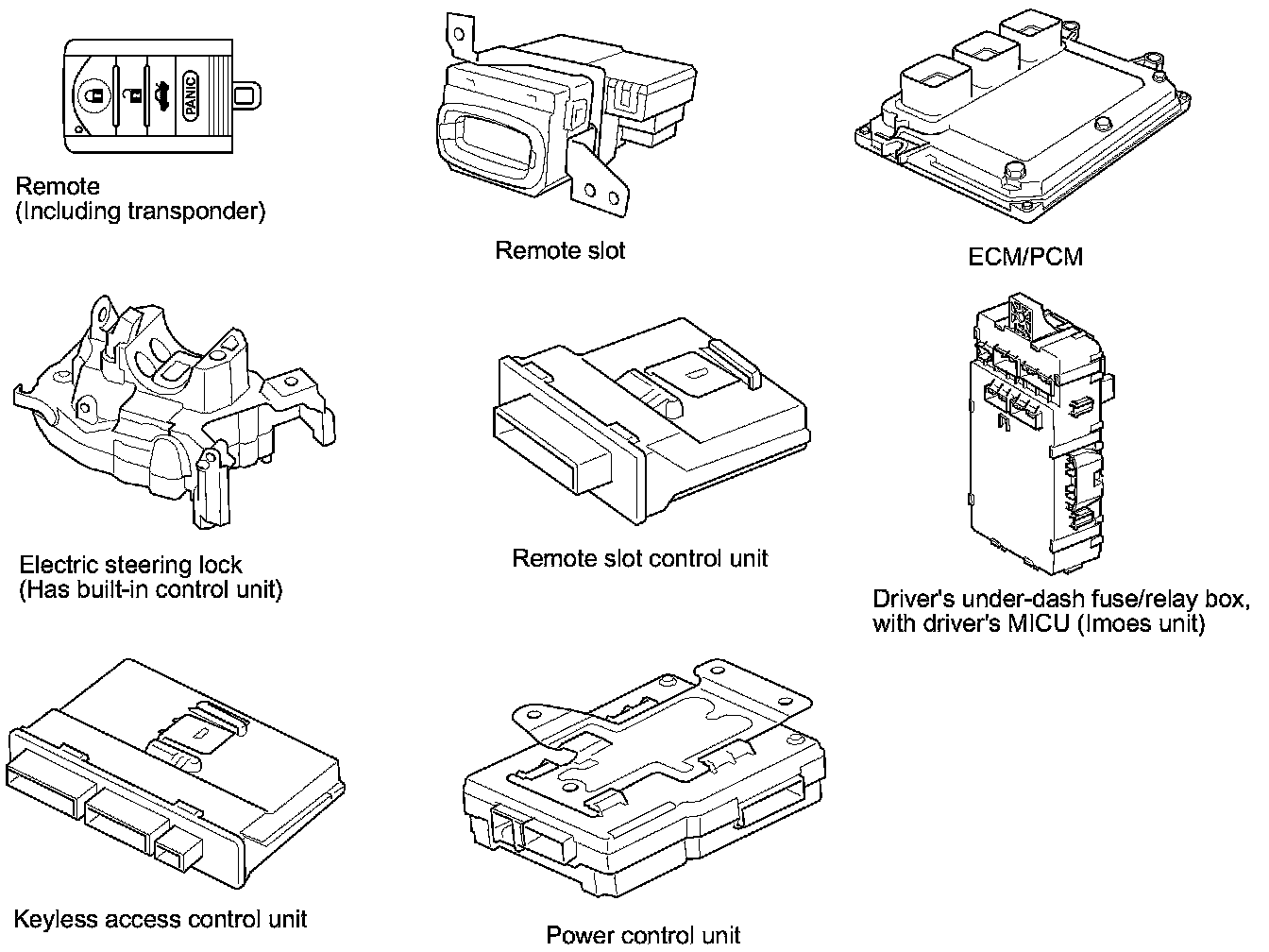 This system consists of a transponder built into the remote, a remote slot control unit, the driver's MICU (has built-in imoes unit), an immobilizer indicator, and the ECM/PCM.