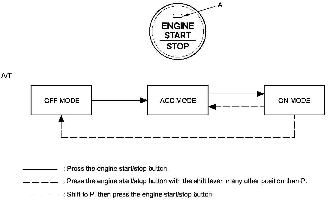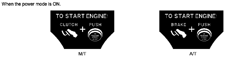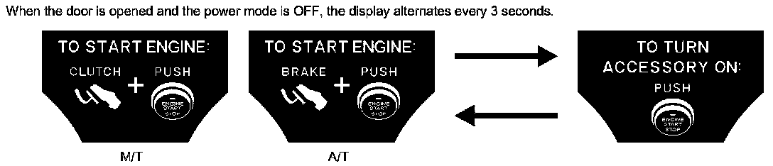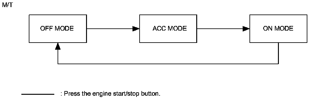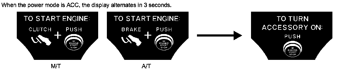 The keyless access system has four power modes: OFF, ACC, ON, and START. The power modes can be changed by pressing the engine start/stop button. The power mode changes to START mode any time the engine start/stop button is pressed while also pressing the brake pedal (A/T) or clutch pedal (M/T).