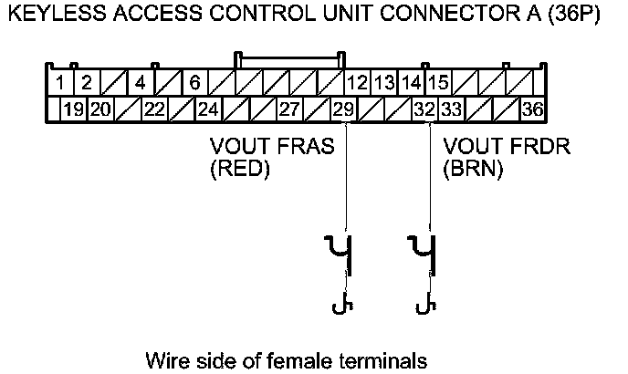 16. Measure the voltage between keyless access control unit connector A (36P) terminal No. 32 and body ground (for driver's door touch sensor), or between keyless access control unit connector A (36P) terminal No. 29 and body ground (for front passenger's door touch sensor) individually.
