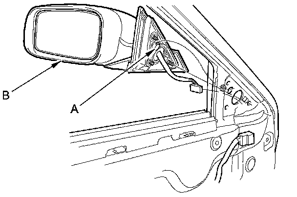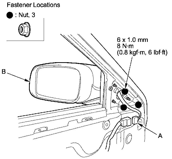 3. While holding the power mirror (B), remove the nuts securing the mirror.