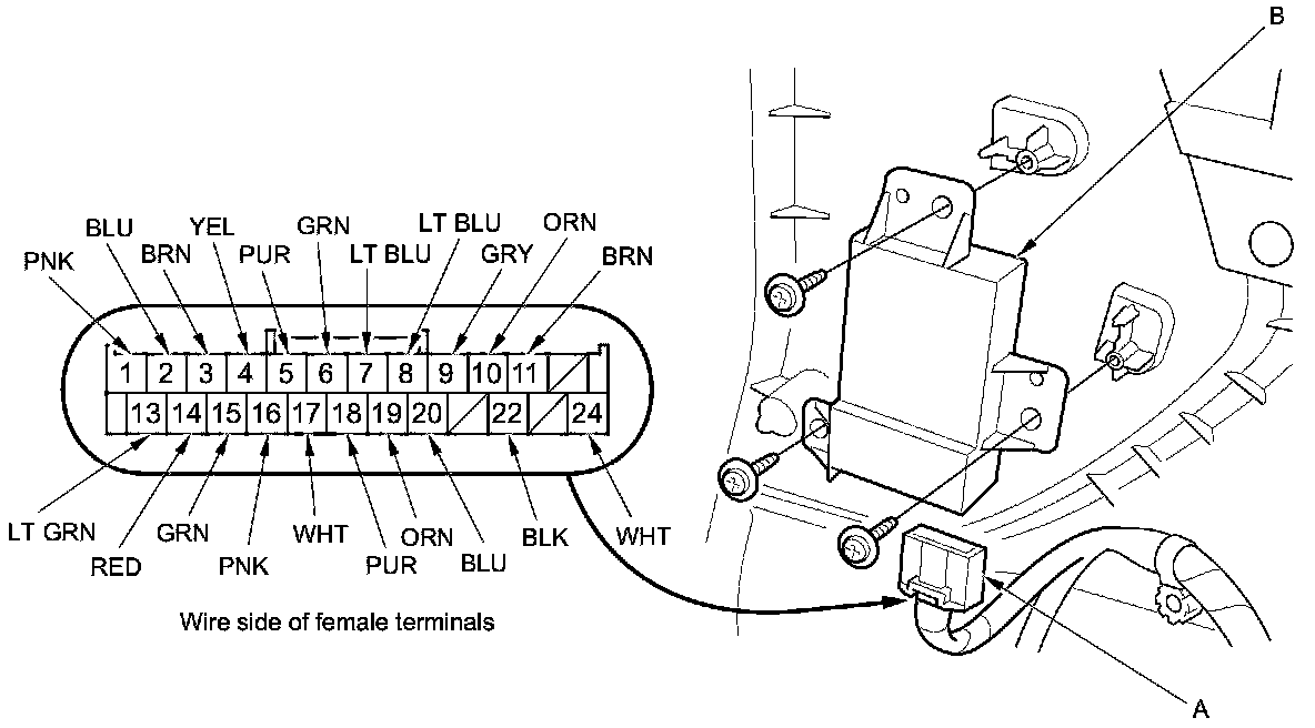3. Disconnect the 24P connector (A) from the power mirror control unit (B).