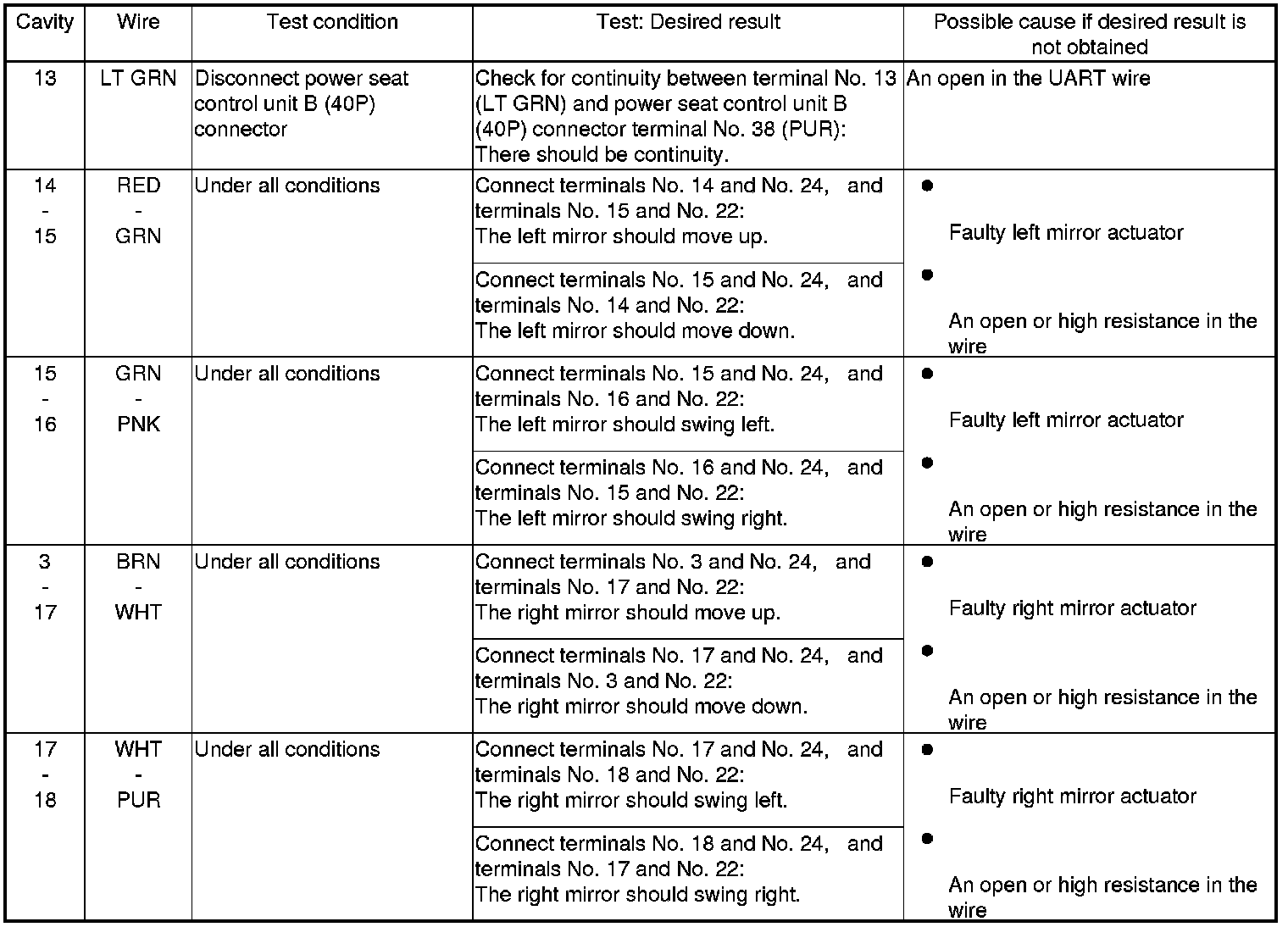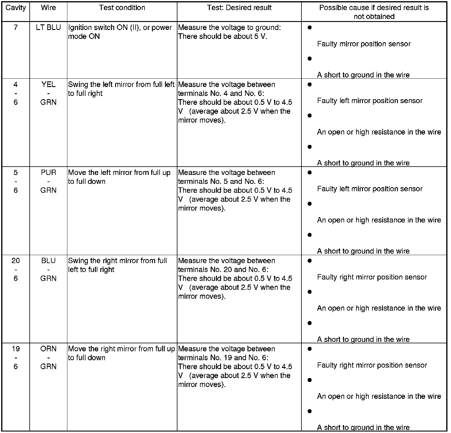 5. Reconnect the connector to the power mirror control unit, and do the following input tests: