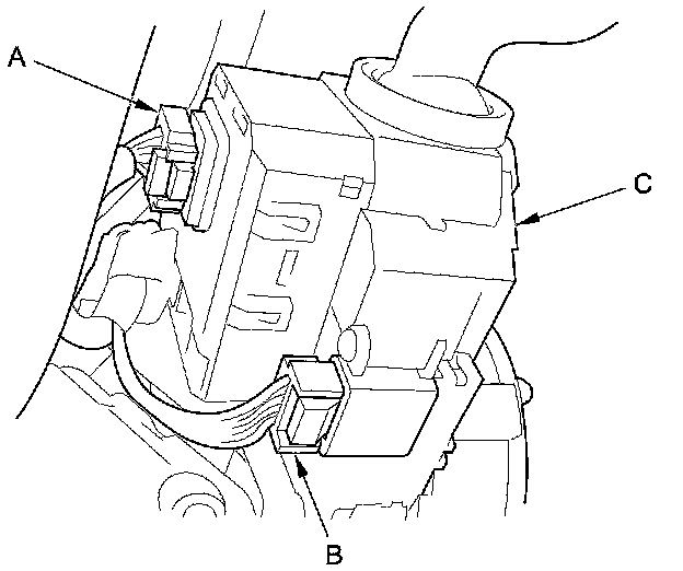 3. Disconnect the combination light switch 12P connector (A) and the steering angle sensor 5P connector (B) from the combination switch assembly/cable reel (C).