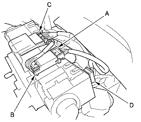4. Disconnect the dashboard wire harness 4P connector (A) from the cable reel 4P connector (B), then disconnect the dashboard wire harness 20P connector (C) and the wiper/washer switch 8P connector (D).