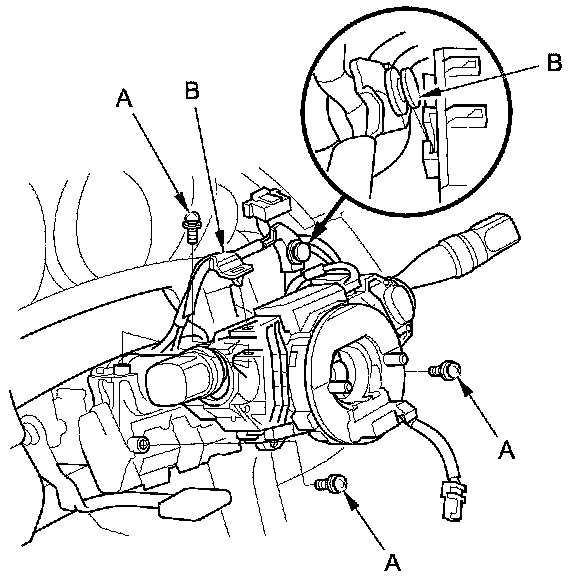 5. Remove the combination switch assembly/cable reel mounting screws (A).