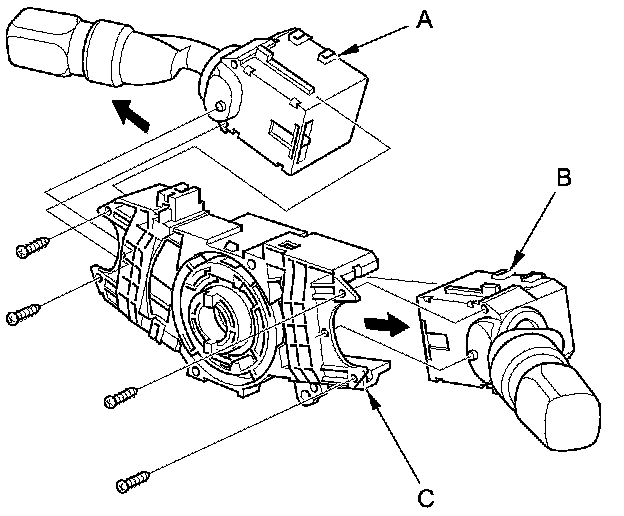 8. Remove the combination light switch (A) and the wiper/washer switch (B) from the combination switch body assembly (C).