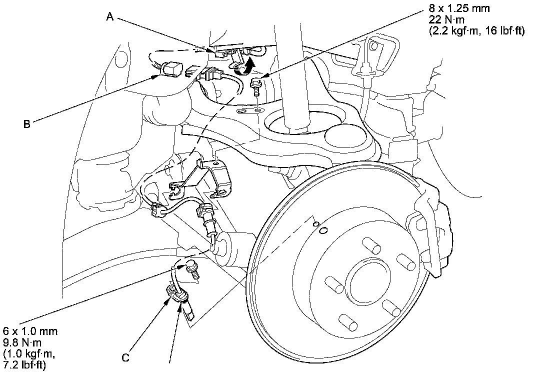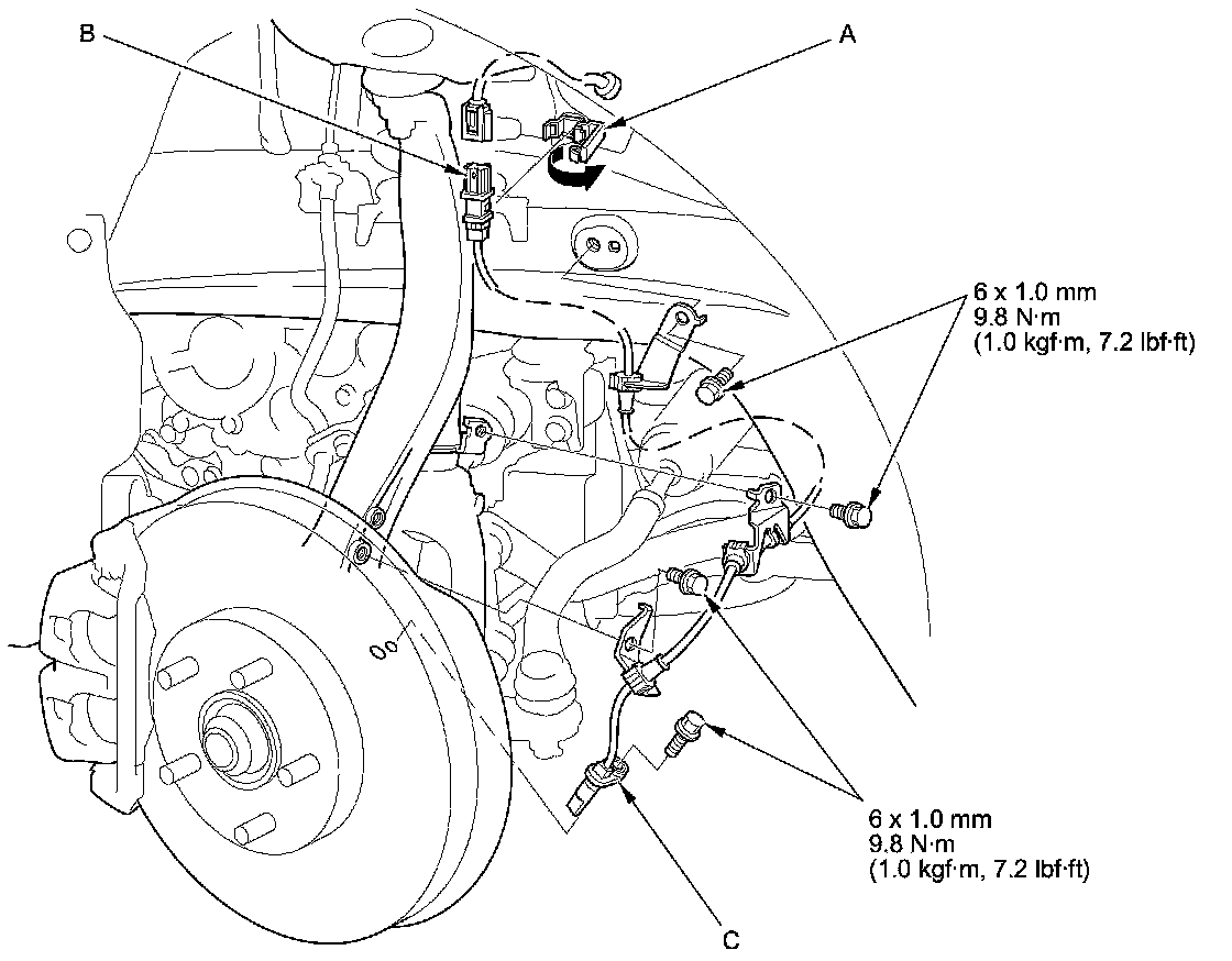 4. Remove the clamps, the bolt, and the wheel speed sensor (C).