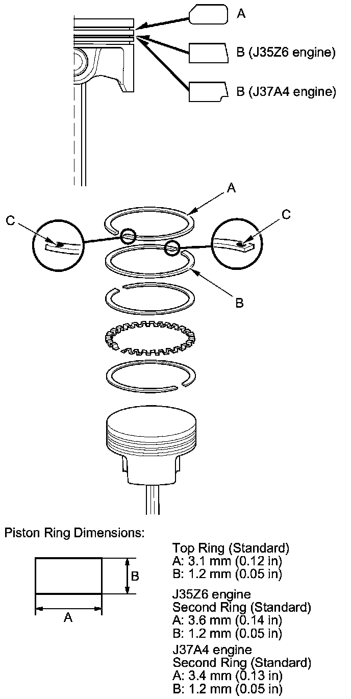 7. Install the rings as shown. The top ring (A) has a 1D mark (J35Z6 engine) or 1E mark (J37A4 engine) and the second ring (B) has a 2X mark (J35Z6 engine) or 2E mark (J37A4 engine). The manufacturing marks (C) must be facing upward.