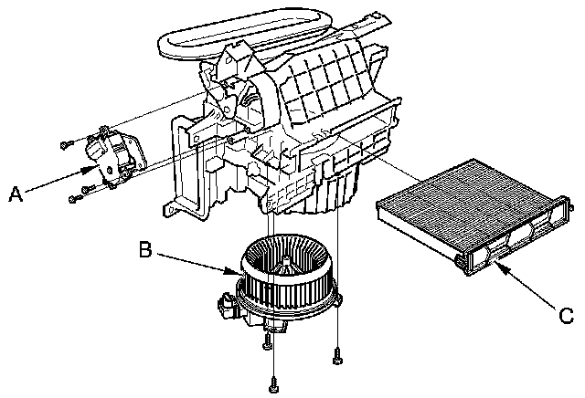 - The recirculation control motor (A), the blower motor (B), and the dust and pollen filter (C) can be replaced without removing the blower unit.