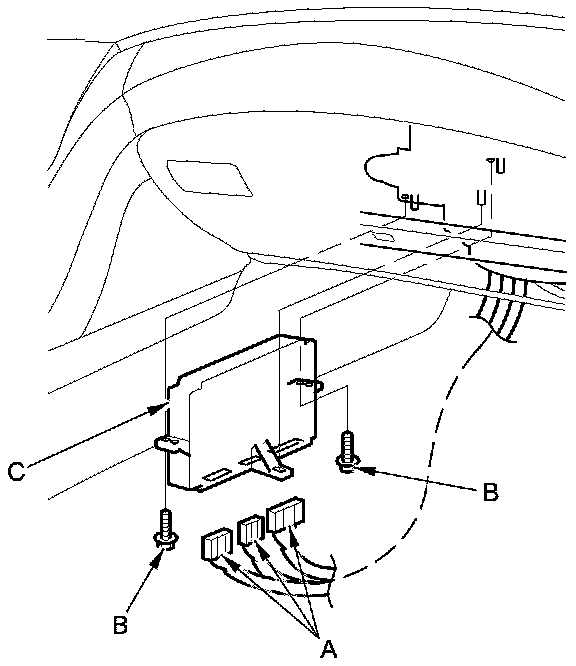 2. Disconnect the connectors (A). Remove the bolts (B) and the climate control unit (C).