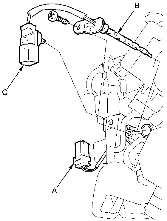 2. Disconnect the 2P connector (A) from the evaporator temperature sensor (B) by pressing the lock tab toward the evaporator housing, then slide the male coupler down, and remove the connector clip (C). Remove the self-tapping screw and the evaporator temperature sensor.