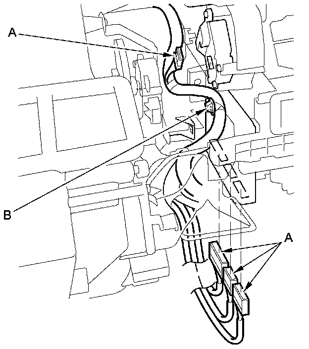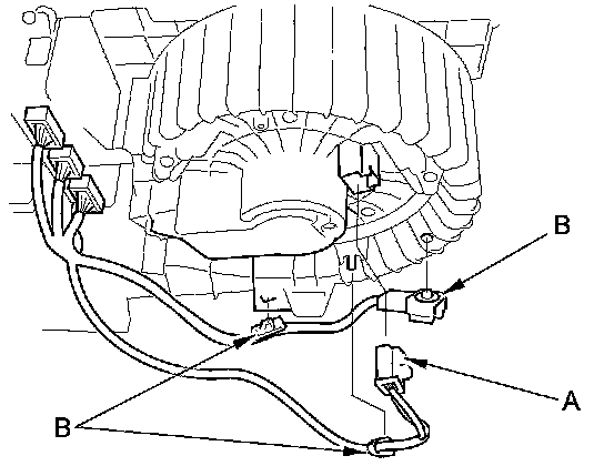 9. Disconnect the connector (A) from the blower motor. Detach the wire harness clips (B).