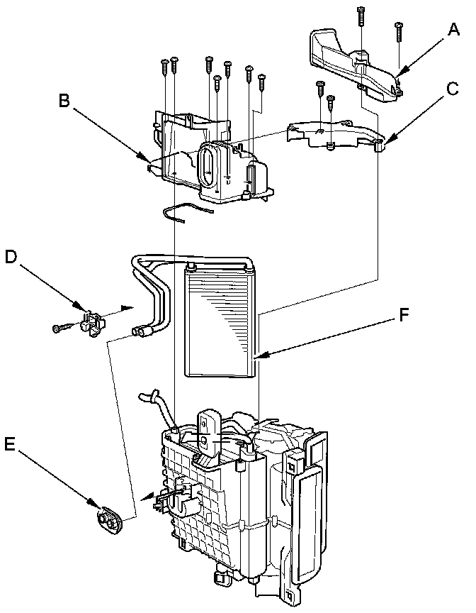 13. Remove the self-tapping screws and the passenger's heater duct (A). Remove the self-tapping screws and the joint duct (B). Remove the self-tapping screw and the heater core cover (C). Remove the self-tapping screw, the heater pipe bracket (D), and the grommet (E), and carefully pull out the heater core (F).