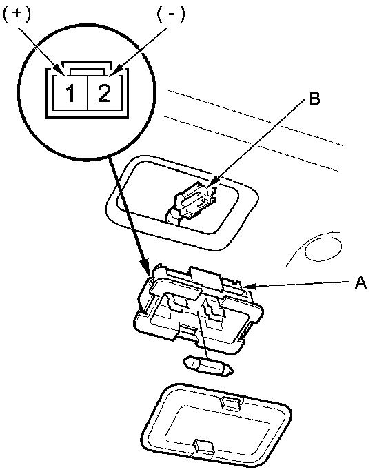 4. Check for continuity between terminals No. 1 (+) and No. 2 (-). There should be continuity. If there is no continuity, check the bulb. If the bulb is OK, replace the trunk light assembly.