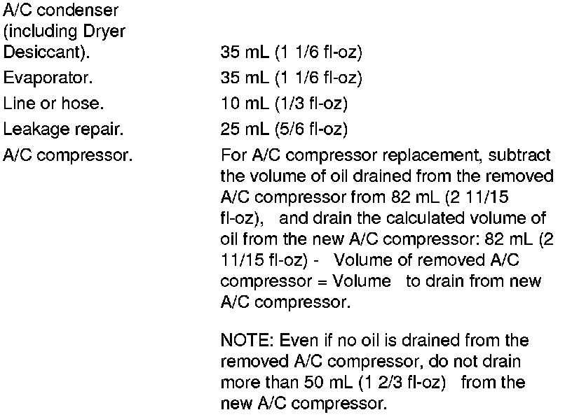 It is important to have the correct amount of refrigerant oil in the A/C system to ensure proper lubrication of the A/C compressor. Too little oil damages the A/C compressor; too much oil reduces the cooling capacity of the system, and can produce high vent temperatures.