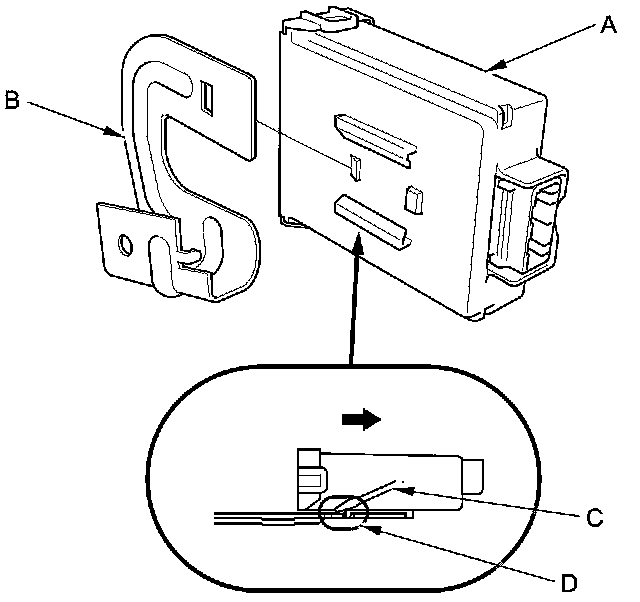 NOTE: To disconnect the TPMS control unit from its bracket, insert a small flat-tipped screwdriver (C) between the TPMS control unit and the bracket shown in (D) to release the hook, then slide out the TPMS control unit.