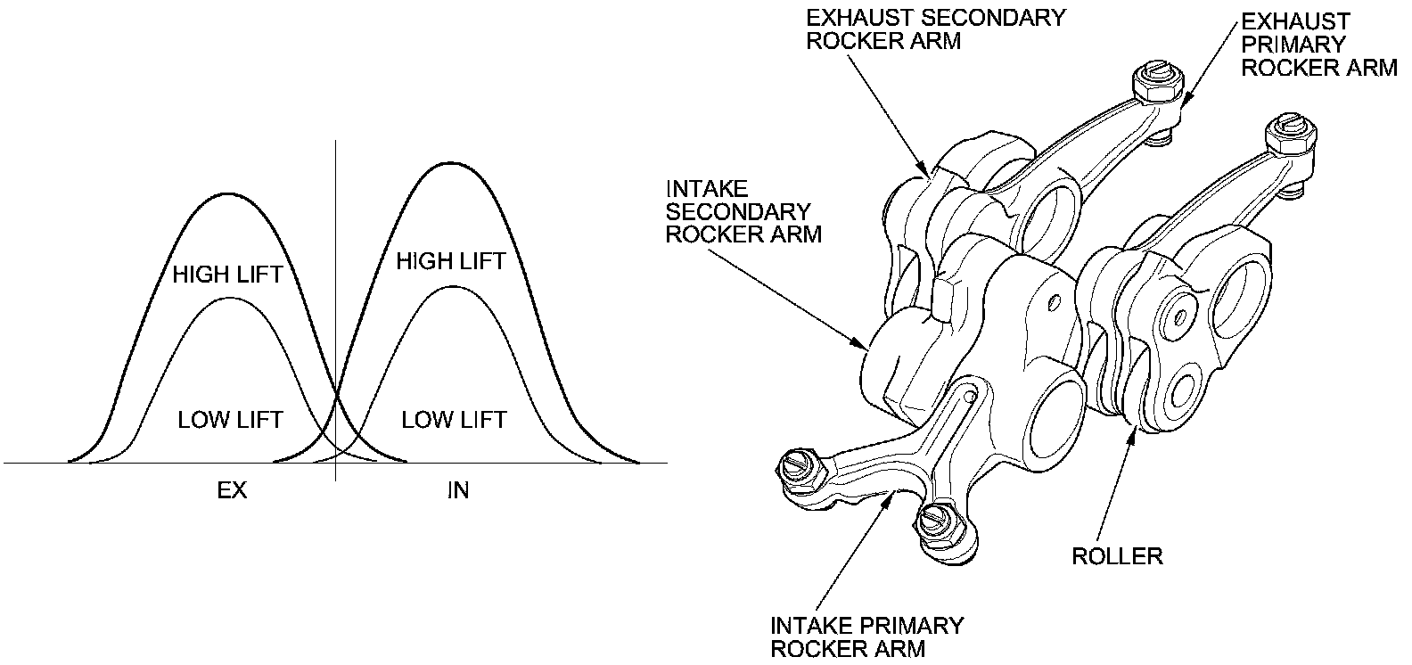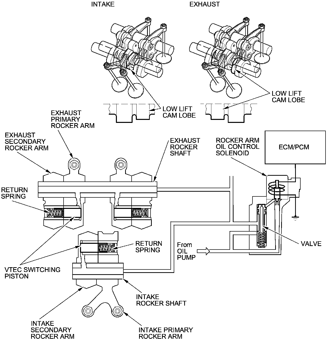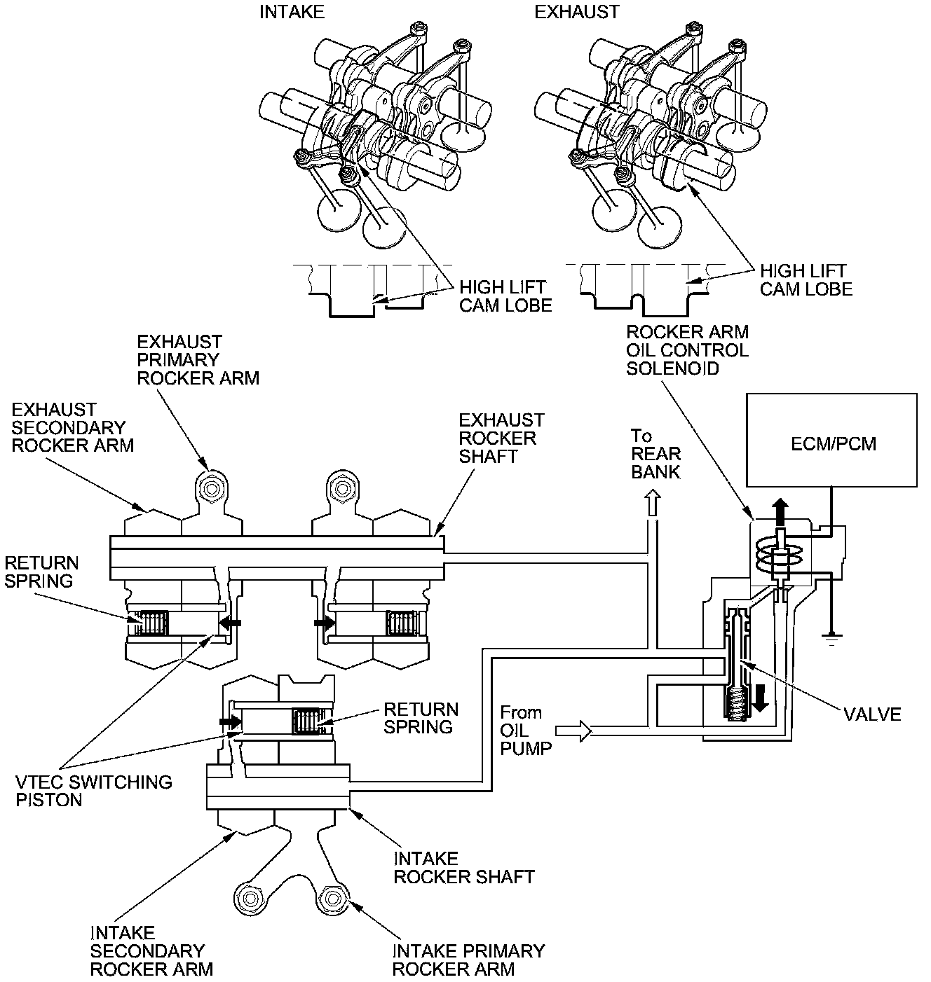 The rocker arm oil control solenoid is turned on by the ECM/PCM. Oil pressure from the rocker arm control solenoid enters into the intake secondary rocker arm and the exhaust primary rocker arm via the rocker shaft, and it moves the VTEC switching piston into the intake secondary rocker arm and the exhaust primary rocker arm. This causes the VTEC switching pistons to lock both rocker arms (primary and secondary) together. Both rocker arms are then lifted by the high lift cam lobe.