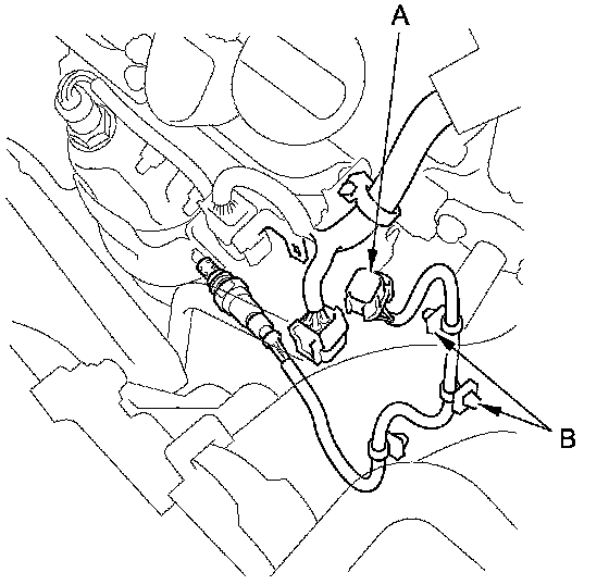 1. Disconnect the front secondary HO2S 4P connector (A), and remove the harness clamps (B).