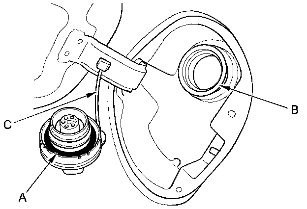 2. Check the fuel fill cap seal (A) and the fuel fill pipe mating surface (B). Verify that the fuel fill cap tether cord (C) is not caught under the cap.