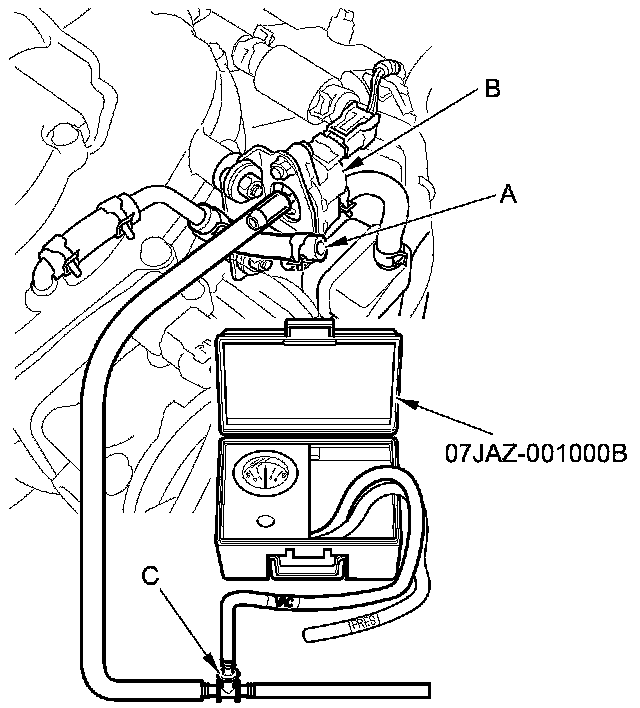 8. Disconnect the vacuum hose (A) from the EVAP canister purge valve (B) in the engine compartment, then connect a T-fitting (C), a vacuum gauge, and a vacuum pump/gauge, 0-30 inHg, to the EVAP canister purge valve as shown.