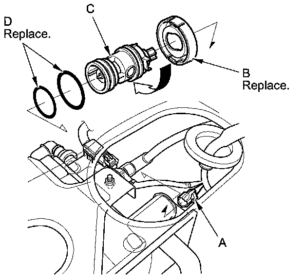 6. Install the parts in the reverse order of removal with new O-rings (D) and a new cap.