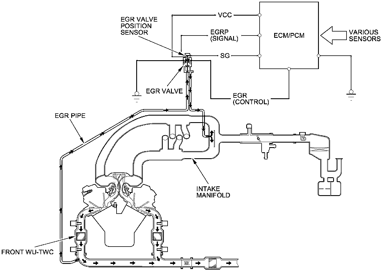 The EGR system reduces oxides of nitrogen (NOx) emissions by recirculating exhaust gas through the EGR pipe to the intake manifold, and into the combustion chambers. Routing the exhaust gas through the EGR pipe helps to prevent carbon deposits from forming in the intake manifold and the throttle body. The ECM/PCM memory includes the ideal EGR valve position for varying operating conditions.