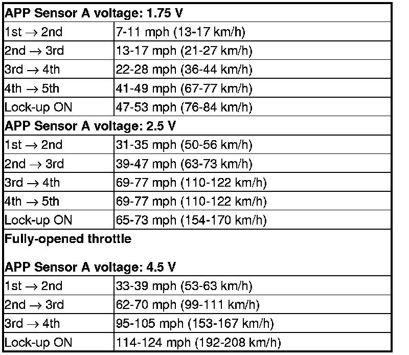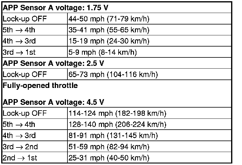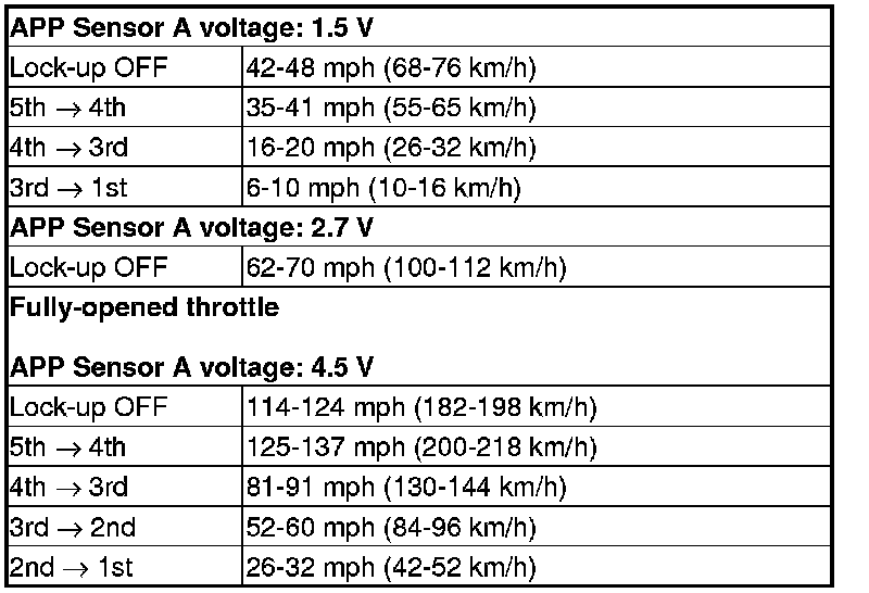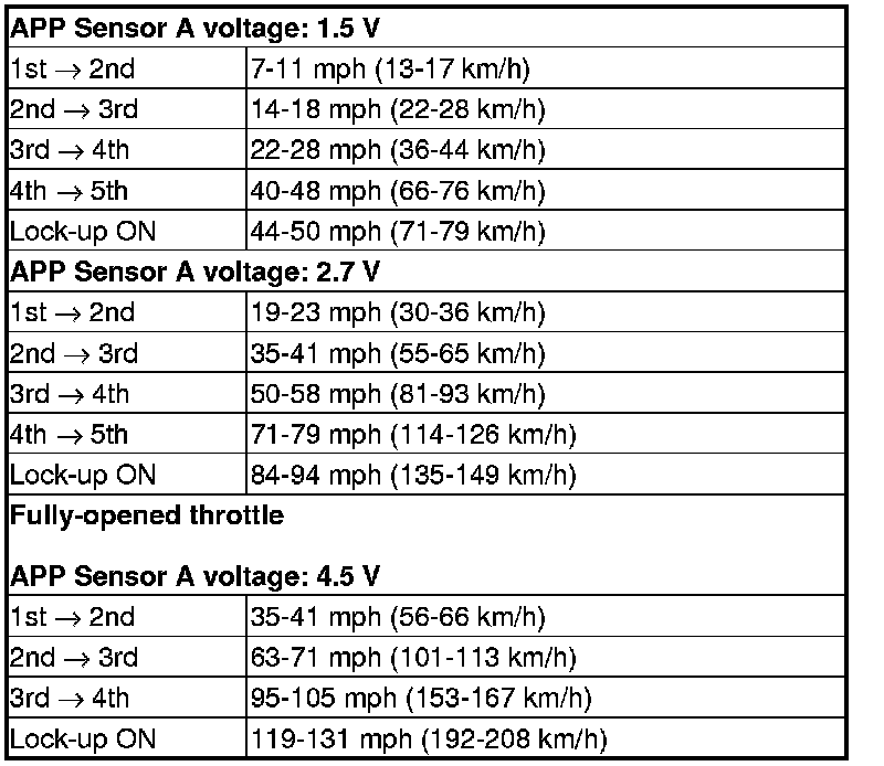 10. Accelerate quickly until APP Sensor A reads 1.75 V (with SH-AWD), 1.5 V (without SH-AWD). Maintain a steady throttle until the transmission shifts to 5th gear, then slow the vehicle and come to a stop.