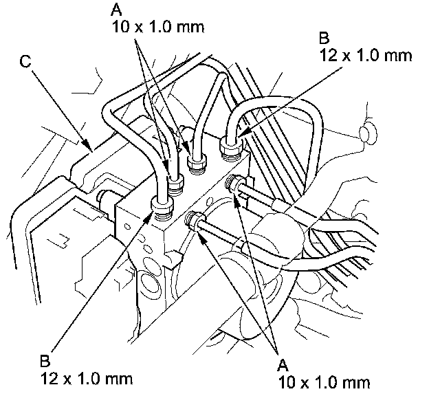 4. Disconnect the 10 mm brake lines (A) and the 12 mm brake lines (B) from the VSA modulator-control unit (C).