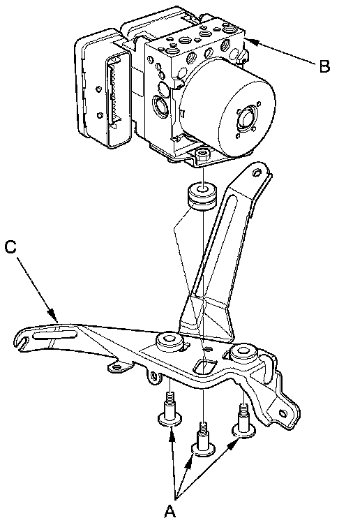 7. Remove the TORX bolts (A), then remove the VSA modulator-control unit (B) from the bracket (C).