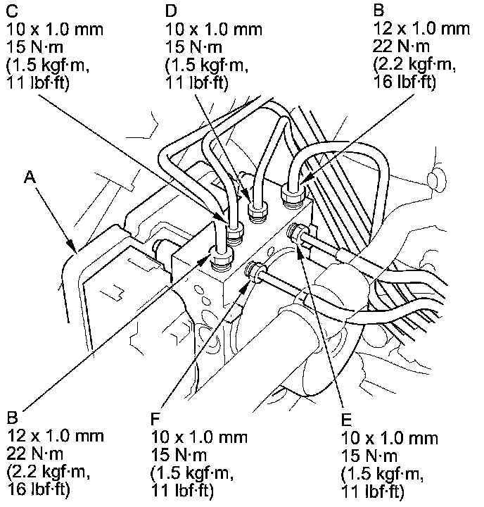 5. Connect the 10 mm brake lines and the 12 mm brake lines to the VSA modulator-control unit (A).