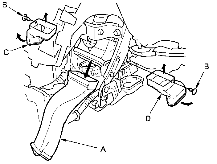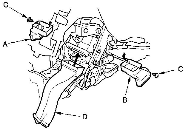 4. Remove the clips (B), then remove the left and right heater ducts (C, D).