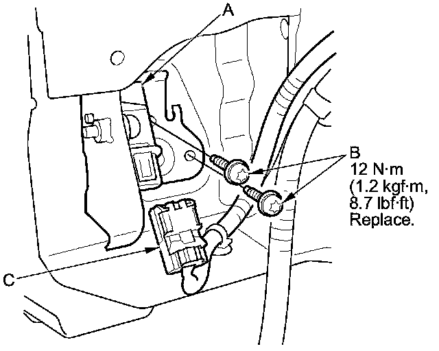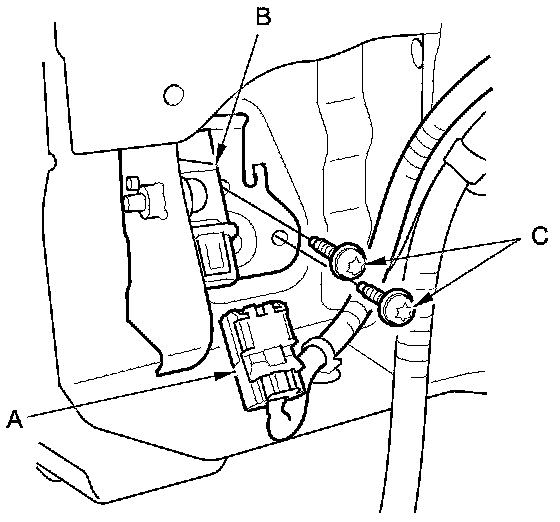 1. Install the front impact sensor (A) with the new TORX bolts (B) using a TORX T30 bit. Connect the left or right engine compartment wire harness 2P connector (C) to the front impact sensor.