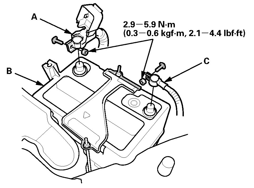 3. Reconnect the positive cable (A) to the battery (B) first, then reconnect the negative cable (C) to the battery.