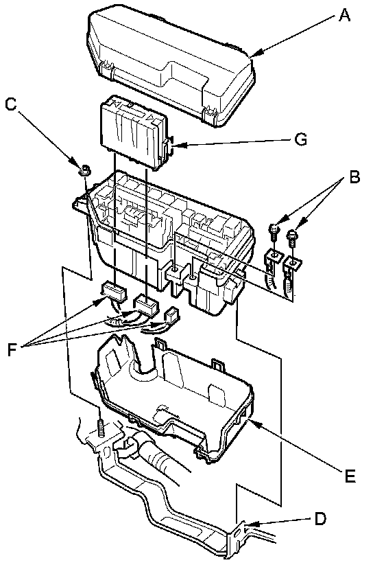 3. Remove the nut (C) and release the tab (D), then remove the bottom cover (E) from the under-hood fuse/relay box.
