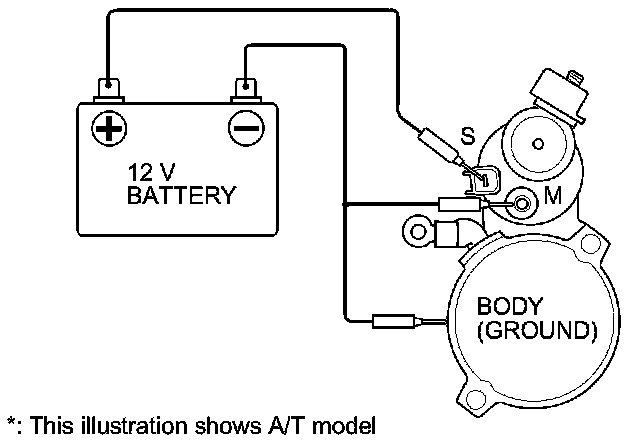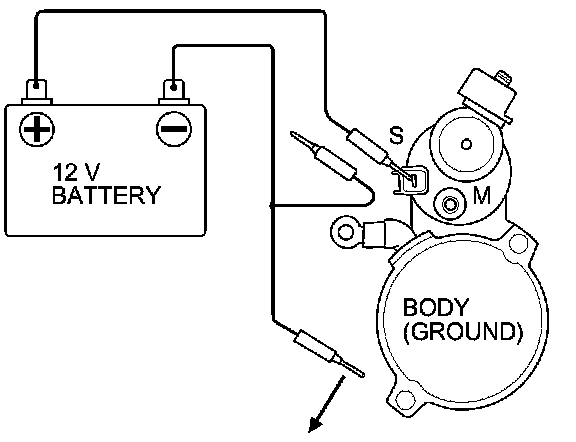 6. Connect the battery as shown. Make sure you disconnect the starter motor wire from the M terminal. If the starter pinion moves out, it is working properly.