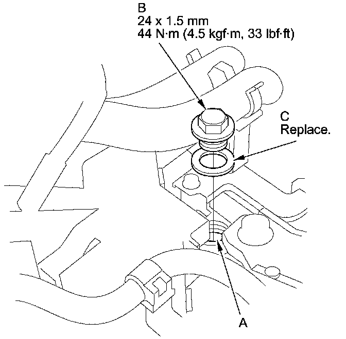 9. Install the ATF filler bolt (B) and a new sealing washer (C).